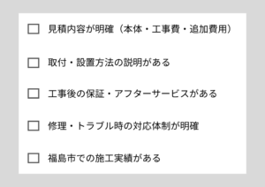 見積内容が明確かどうか、工事後のサービスや保証があるかを確認しましょう。