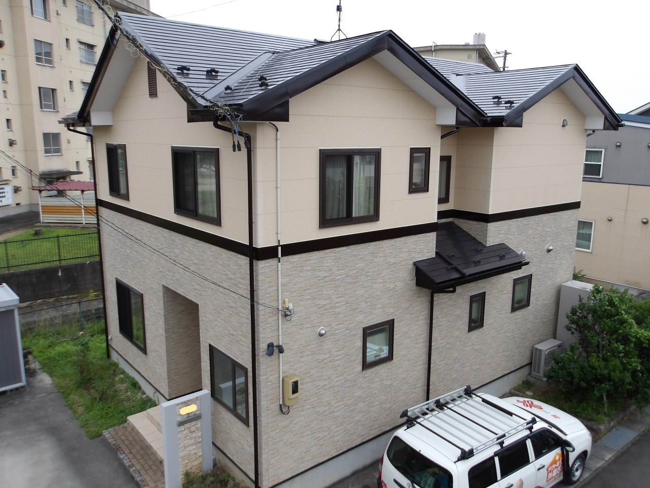 紫外線により色あせていた屋根・付帯部が、ブラウンやブラックへと生まれ変わり、外壁のクリーム色と調和した落ち着きある外観に仕上がりました。全体の印象がぐっと引き締まり、よりメリハリのあるお住まいになっています。