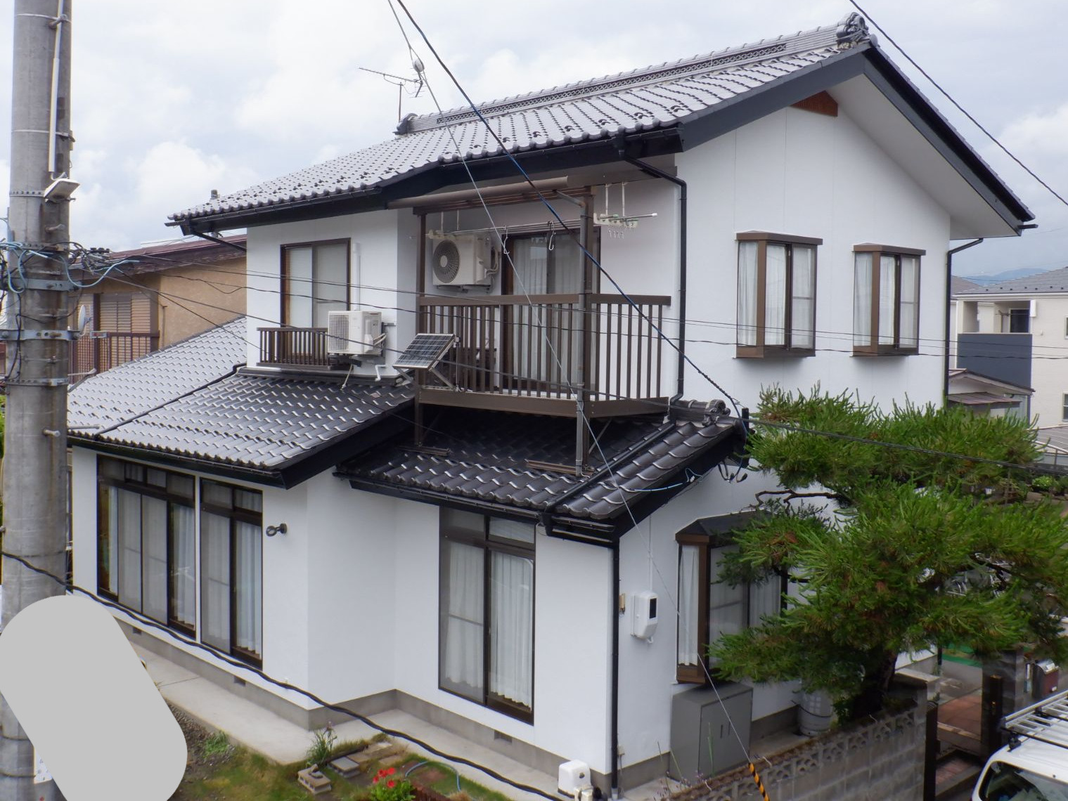 既存のブラック瓦を活かし、外壁と付帯部の色味を整えたことで、和風のお住まいがより端正な佇まいになりました。ほんのりブルーを含んだホワイトの外壁が爽やかさを添え、ブラックで統一した付帯部が全体を美しく引き締めています。