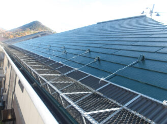 今回は屋根の色選びが外観の印象を左右するポイントでしたので、周囲とのバランスと重厚感を意識して濃いグリーンをご提案しました。あわせてベランダ笠木の板金巻きや落雪防止ネットも施工し、見た目と機能性の両面を整えています。この度は大切なお住まいをお任せいただき、ありがとうございました。