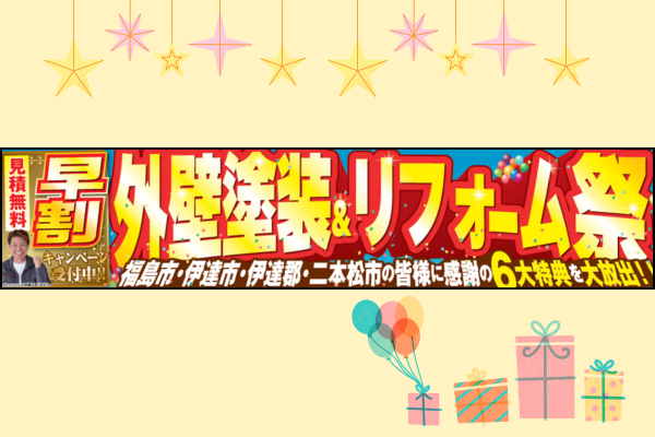| イベント内容 | 🎉【福島市・伊達市・伊達郡・二本松市にお住まいの皆さまへ】🎉 「春に向けて塗装を考えている」 ✅ 春施工の先行予約受付中! 福島市・伊達市・伊達郡・二本松市の皆さまに、 お住まいの改修は一生のお付き合い。 開催期間は ★~2月28日(土)まで★ 👉 詳しくはこちら【】 |
