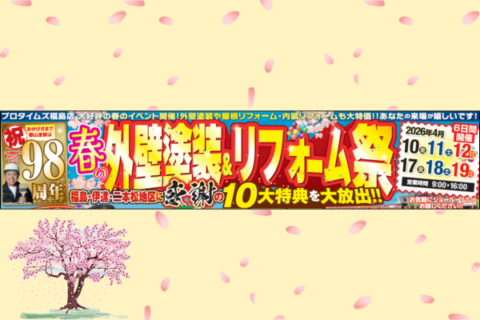 | イベント内容 | 【春の外壁塗装&リフォーム祭 開催】 毎年大好評!春の大型イベント開催✨ 外壁塗装・リフォームをご検討中の方はもちろん、 しつこい営業は一切行っておりませんので、安心してご来場ください😊 🎁 感謝の10大特典 🎁をご用意!! お得に塗装・リフォームをするチャンスは今だけ! |
